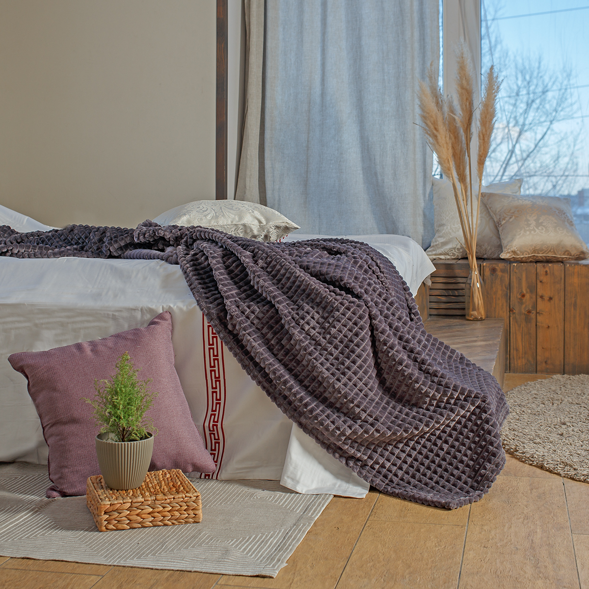 Плед графитового цвета смотрится гармонично в любом интерьере. Он придает свежие яркие нотки помещению, а нестандартная текстура делает оформление динамичным. Такой цвет является по-настоящему универсальным, он способен стать украшением в комнате мужчины или женщины, а также семейной пары.