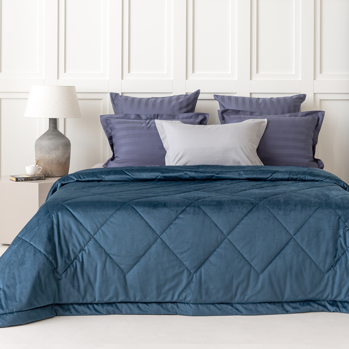 Состав: бархат 100% пэ, наполнитель - полиэфирное волокно. Подклад покрывала – микрофибра велюр, за счет своей фактуры он предотвращает скольжение покрывала на кровати. Стежка в виде ромбов.