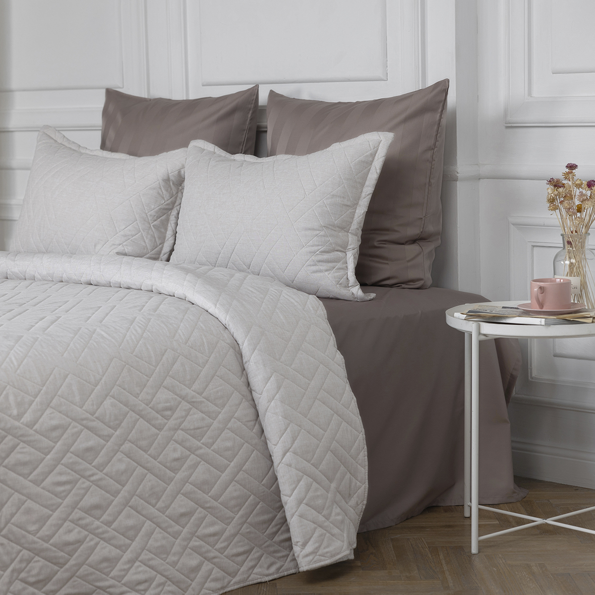 В комплект входит: покрывало на кровать 220x240 см и декоративные стеганые наволочки 50x70 см с ушками – 2шт. Состав: 60% вискозы и 40% хлопка, обеспечивает нежное прикосновение и комфортный сон. Покрывало имеет тактильно приятную Soft Touch фактуру и матовую поверхность для максимального комфорта. Не скользит, идеально принимает форму кровати.