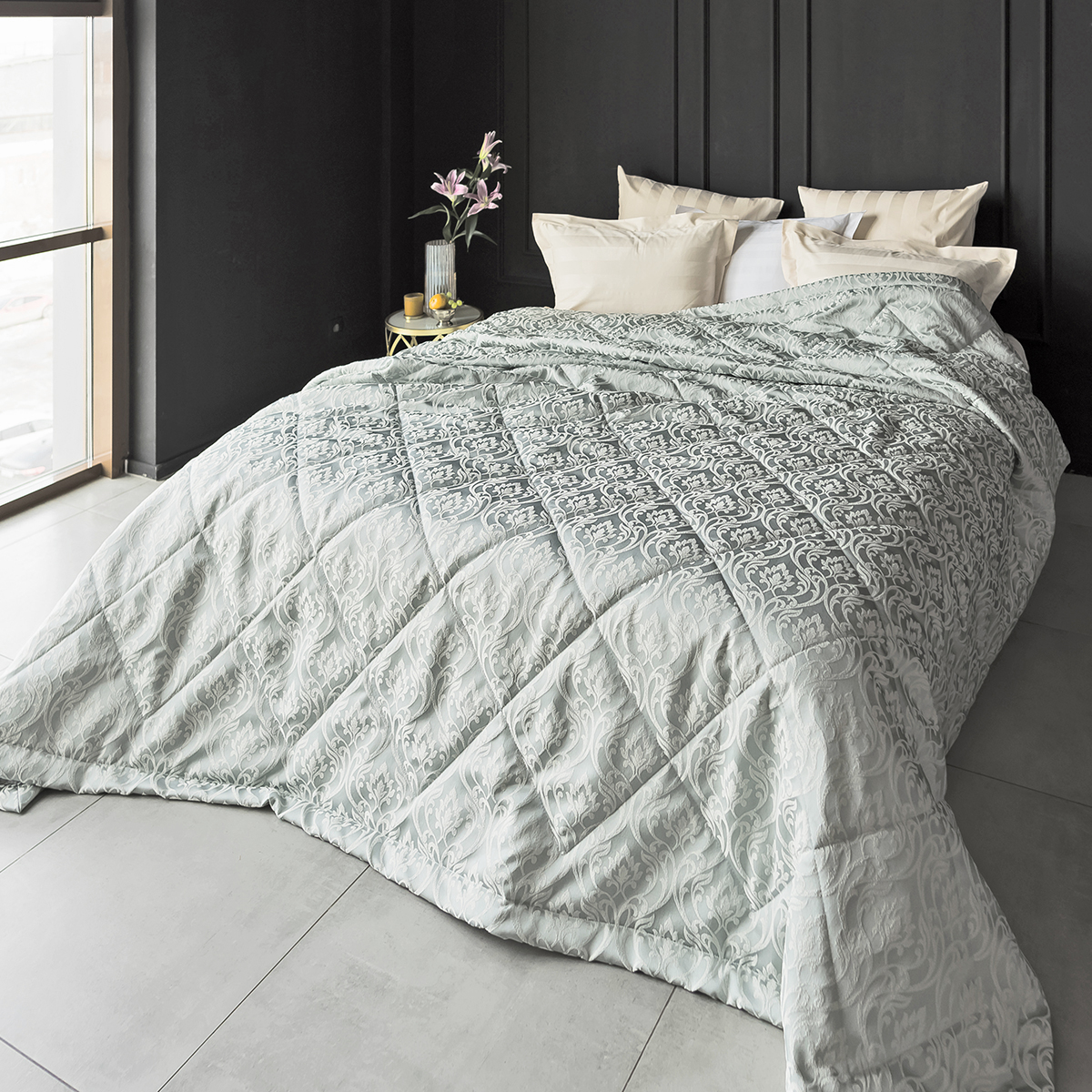Состав: ткань портьерная 100% пэ, наполнитель - полиэфирное волокно. Стежка в виде ромбов. Подклад покрывала – микрофибра велюр, за счет своей фактуры он предотвращает скольжение покрывала на кровати.