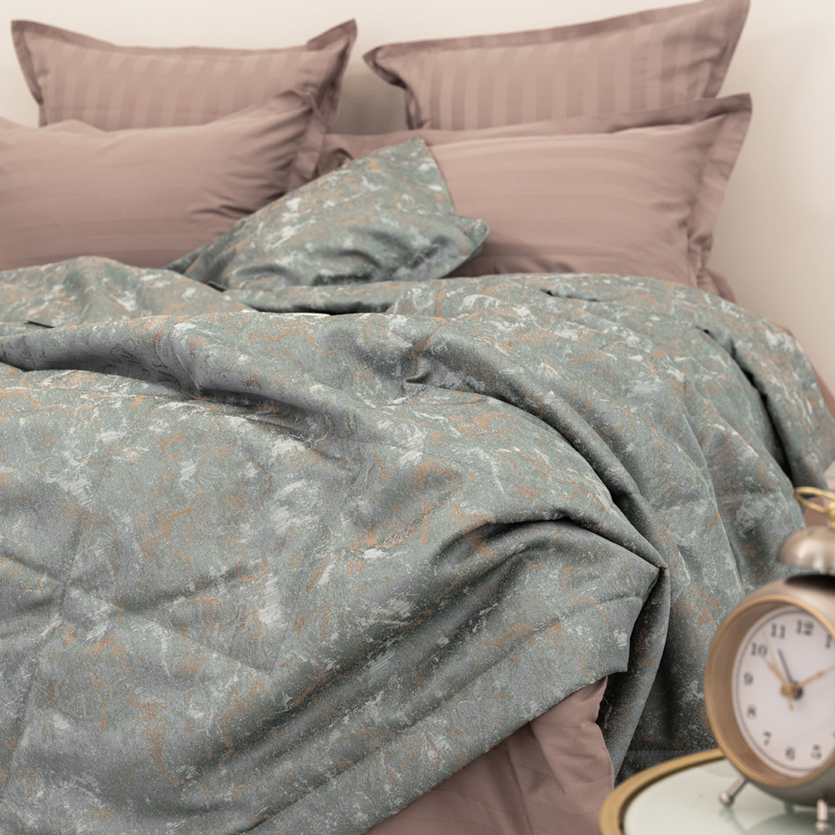 Состав: ткань портьерная жаккард 100% пэ, наполнитель - полиэфирное волокно. Стежка в виде ромбов. Подклад покрывала – микрофибра велюр, за счет своей фактуры он предотвращает скольжение покрывала на кровати.