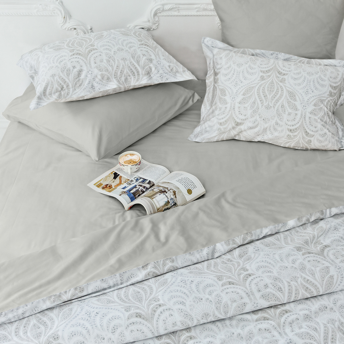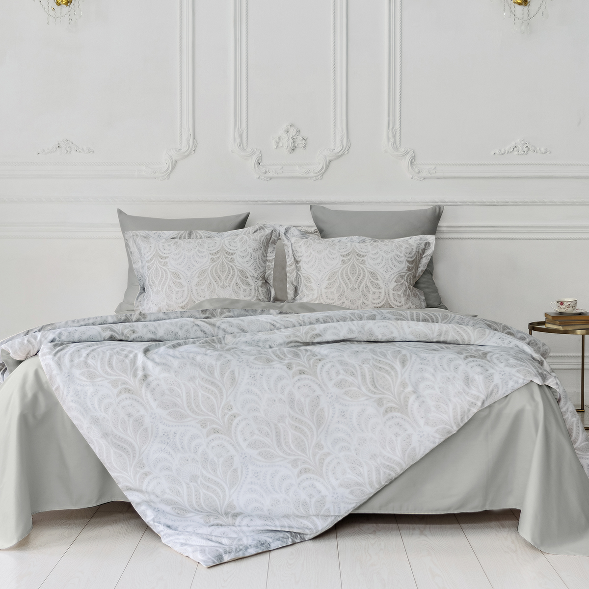 «Франческа» - Комплект с утонченным узором станет отличным выбором для любителей сдержанной элегантности. Легкие линии и деликатные формы, выполненные в пастельных оттенках серого и белого, создают атмосферу уюта и спокойствия. Нежный орнамент, словно сотканный из тончайших нитей, напоминает легкое дыхание природы, придавая интерьеру утонченность и гармонию.