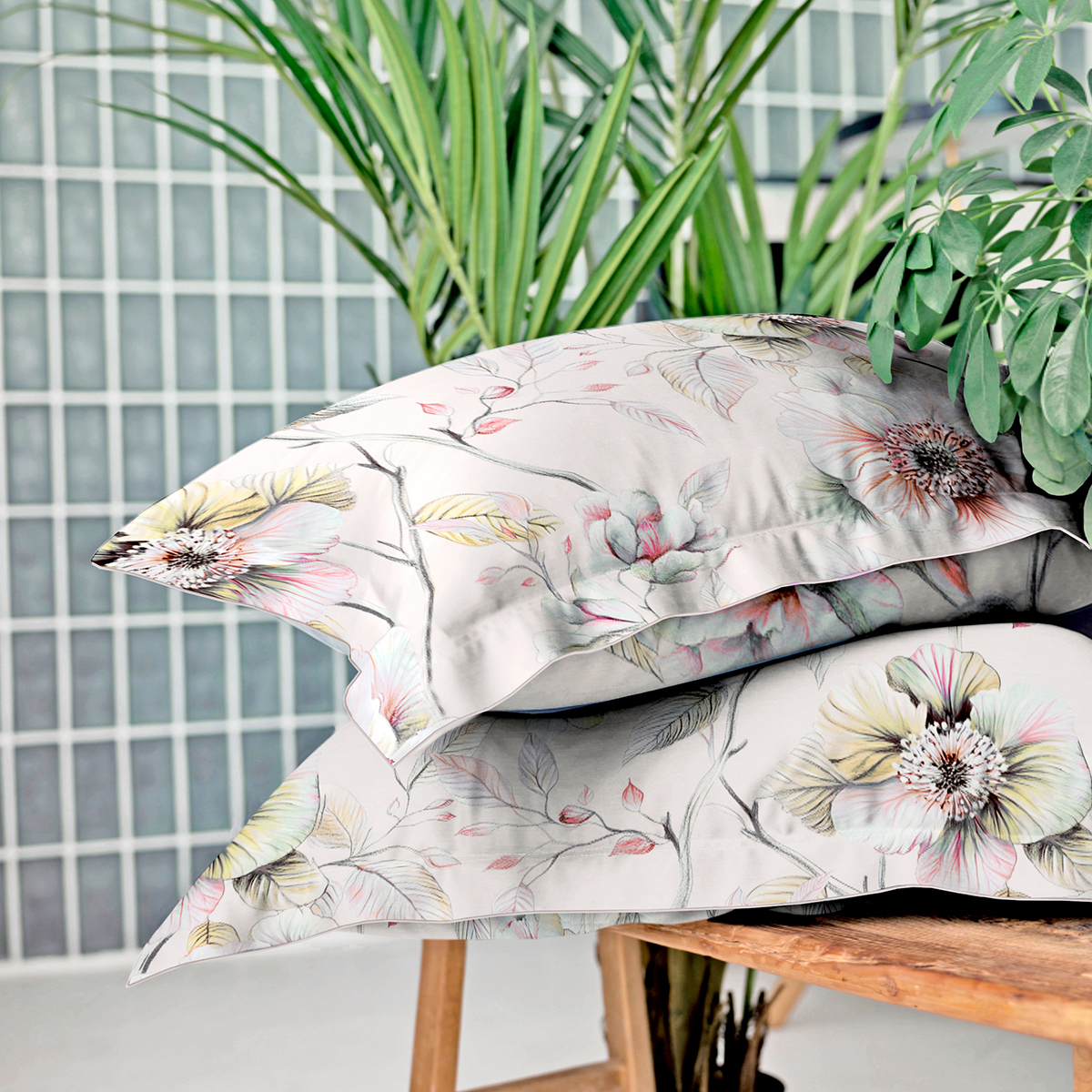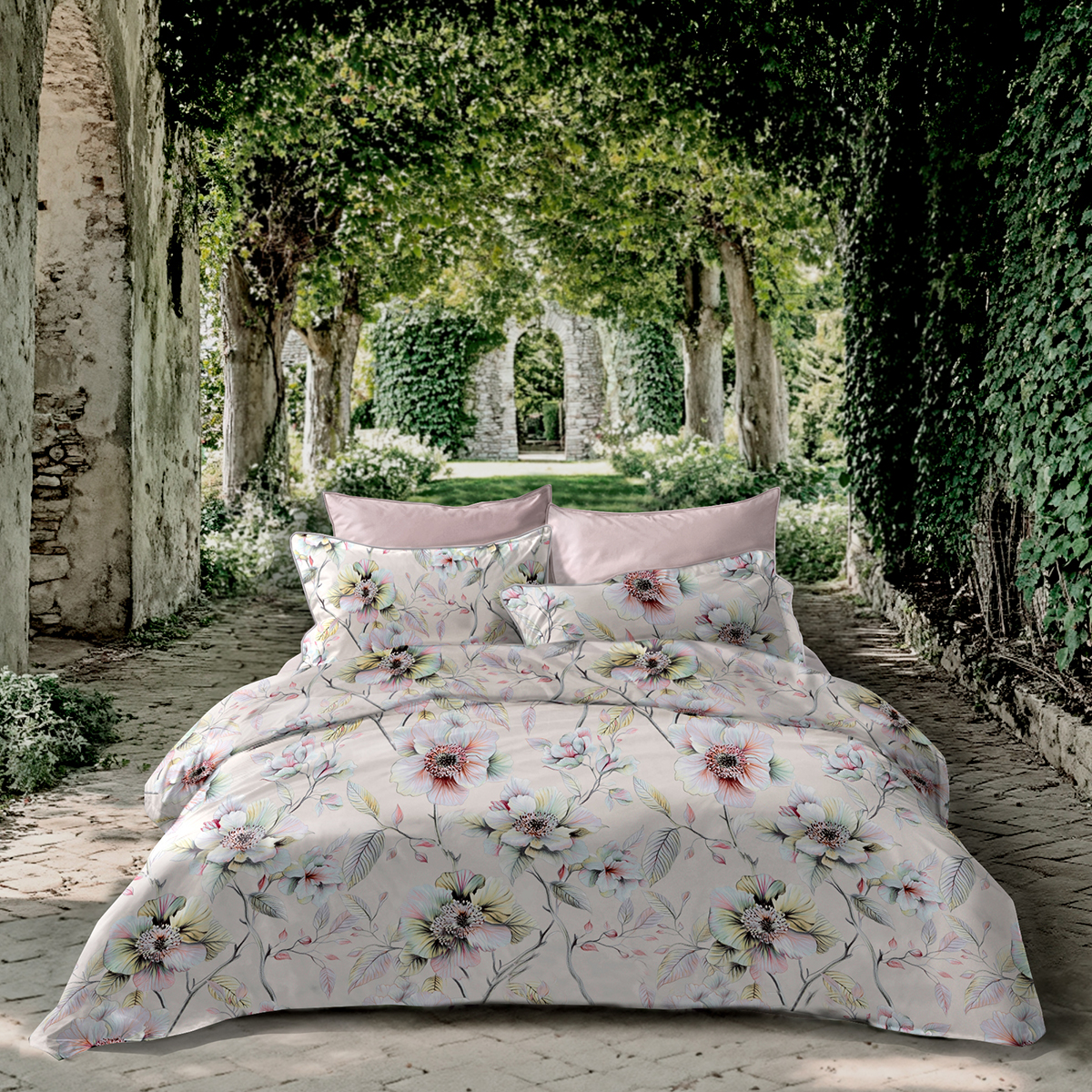 Сильвана. Постельное бельё словно соткано из утреннего света и тонких акварельных грёз. Фон — мягкий, как сливочный шёлк, становится идеальным полотном для нежных, почти воздушных соцветий. Ощущение свежести, лёгкости и безмятежности, превращает спальню в оазис утончённой гармонии.