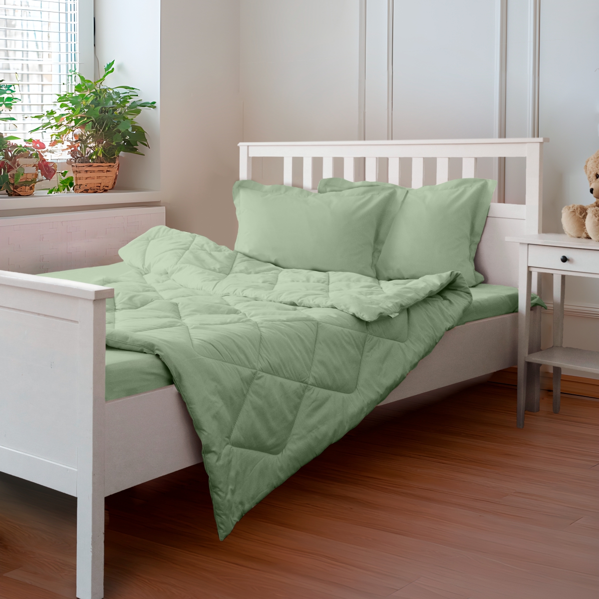 За постельным бельем с одеялом легко ухаживать, его можно стирать в стиральной машине, оно выдерживает до 500 стирок.