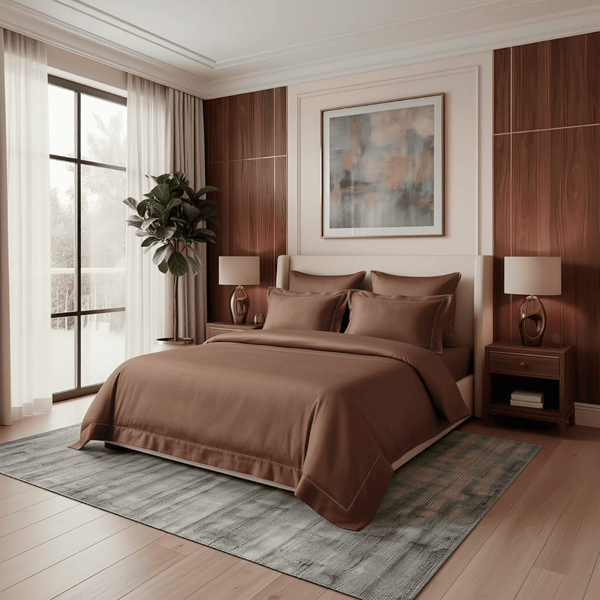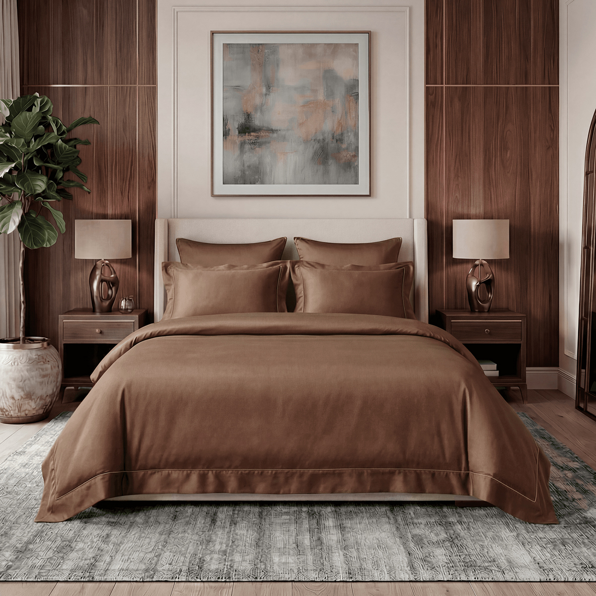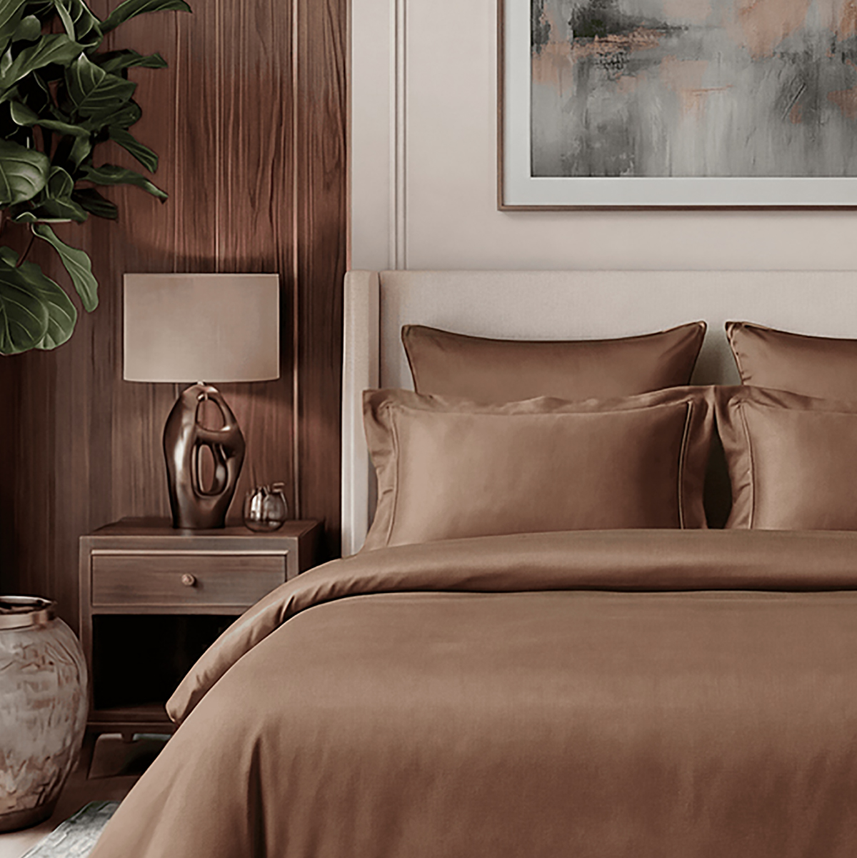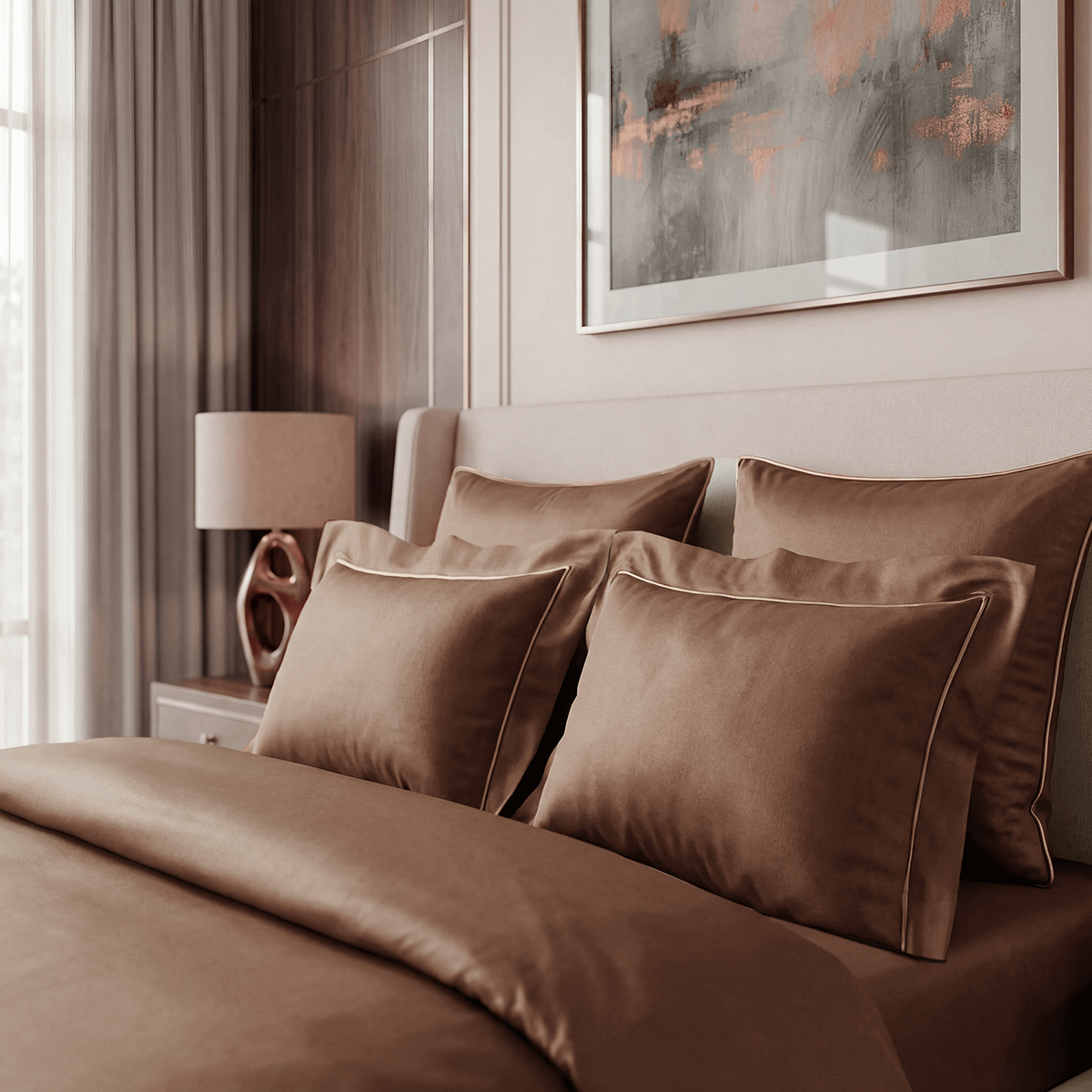 Редкий длинноволокнистый хлопок: нити прочнее и тоньше обычного, поэтому ткань не пиллингуется и не теряет форму. Сатиновое плетение создаёт живое сияние, как у шёлка, но с комфортом дышащего хлопка. Не электризуется, не скользит, приятен к телу. Выдерживает 500+ стирок без потери яркости и мягкости.