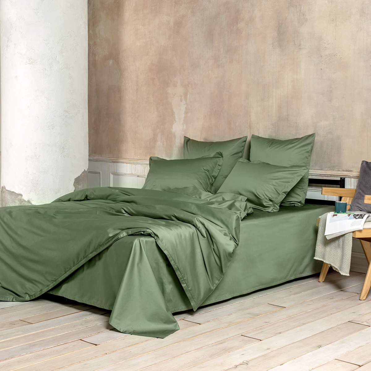 Зеленый, но не травяной — скорее, как свежие листья базилика в итальянском ресторане. Он привносит в спальню ноту свежести без навязчивости.