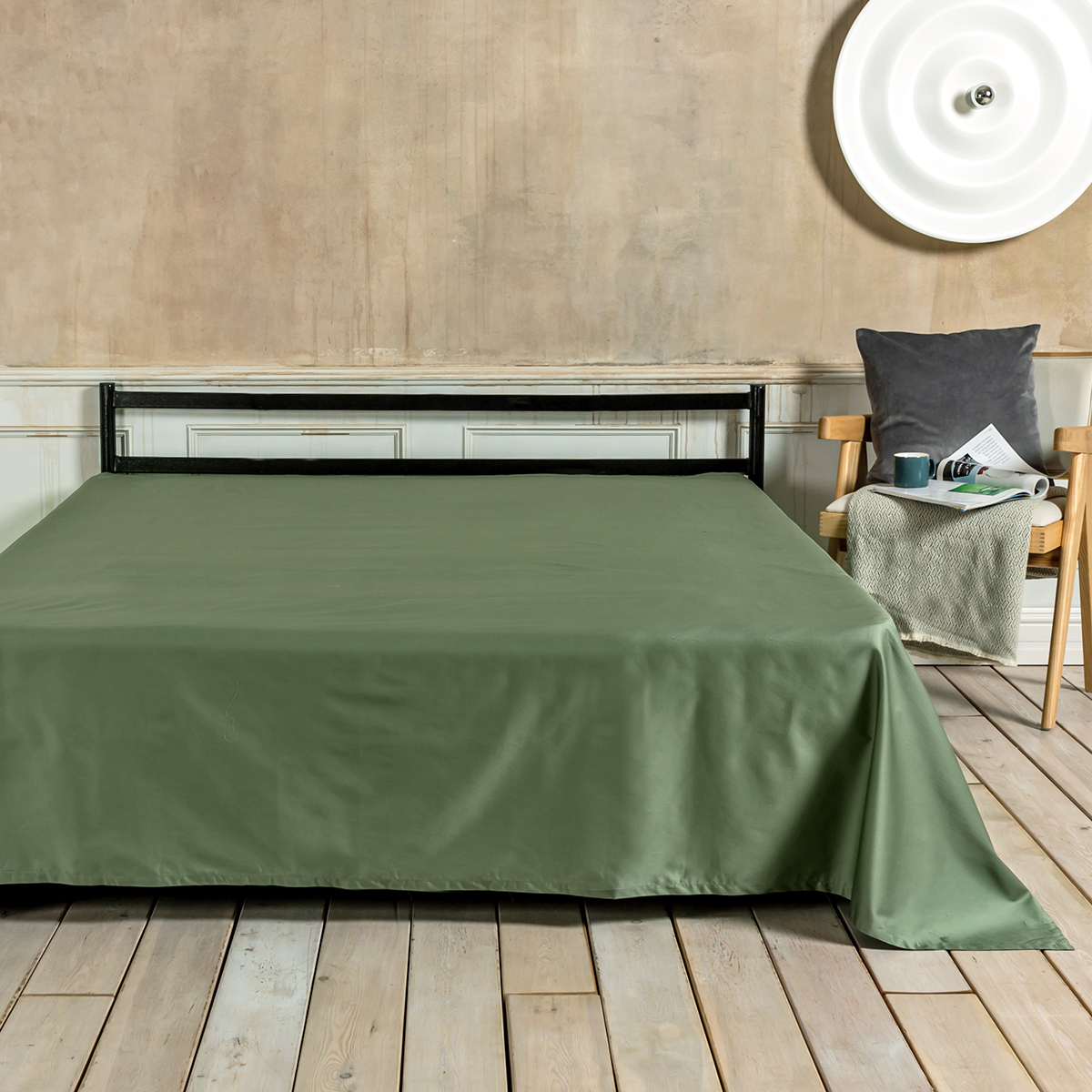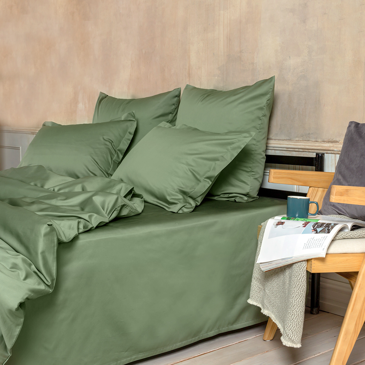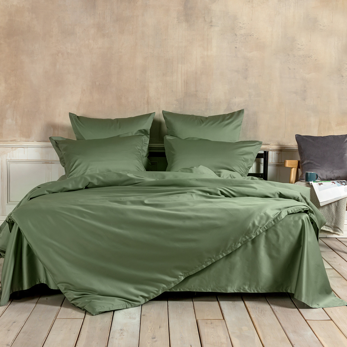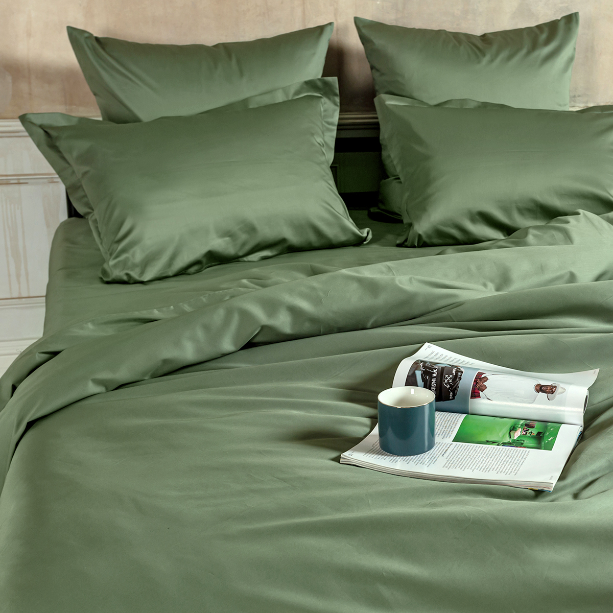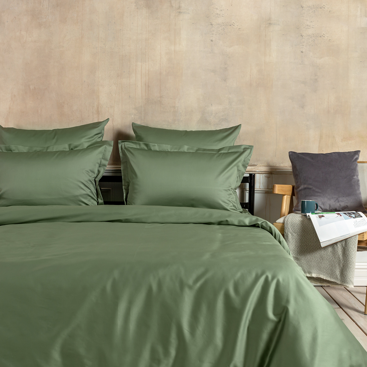 Зеленый, но не травяной — скорее, как свежие листья базилика в итальянском ресторане. Он привносит в спальню ноту свежести без навязчивости.